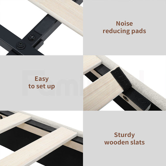 --【Sturdy & Durable Structure】Built with high-quality steel, solid wood slats, and reinforced by nine heavy-duty legs, the Familand platform bed frame queen size supports up to 250kg. This robust design evenly distributes weight and prevents mattress sagging, ensuring a quiet, comfortable sleep experience.