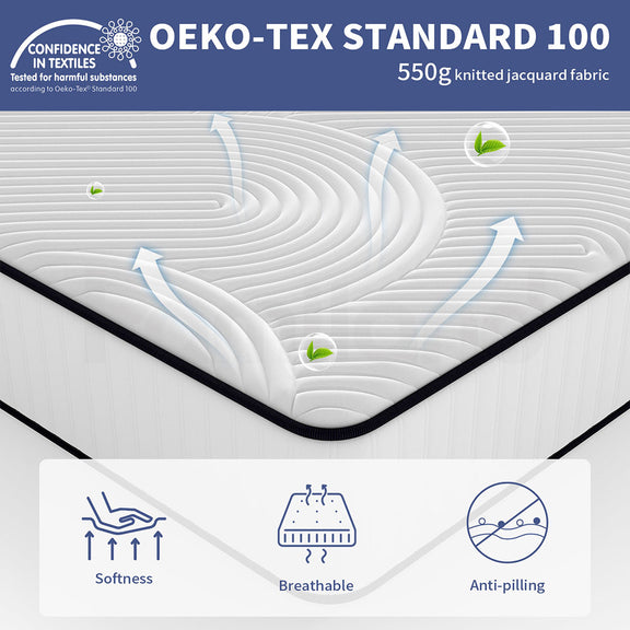 ---【High-Quality and Healthy Materials】The Familand mattress features a top cover made from 550g skin-friendly knitted fabric, compared to the 380g surface material commonly found on the market. Certified by OEKO-TEX Standard 100, this fabric is free from harmful substances, breathable, and moisture-absorbing, efficiently dissipating body heat and accelerating moisture evaporation. This ensures a safe and comfortable sleep environment for everyone.
