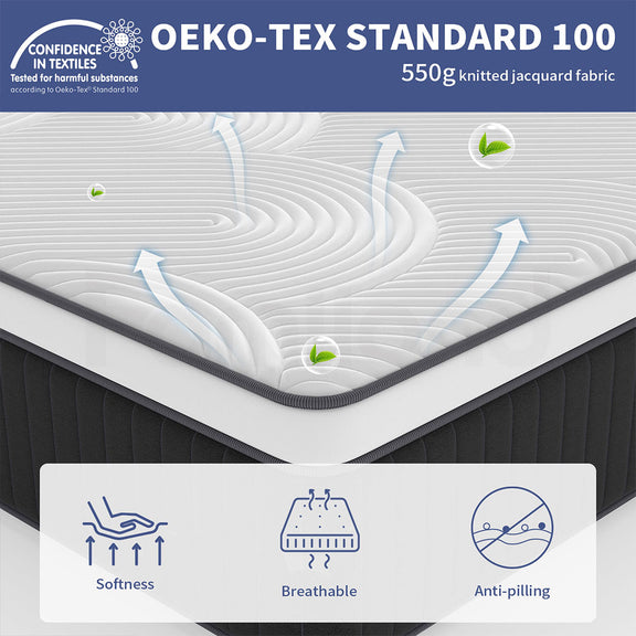 ---High-Quality and Healthy Material: Unlike the standard 380g surface materials available, the Familand mattress features a 550g skin-friendly knitted fabric top cover, certified by OEKO-TEX Standard 100. It is free from harmful substances, breathable, and moisture-absorbing, effectively dissipating body heat and accelerating moisture evaporation. This ensures a safe and comfortable sleeping environment for everyone.
