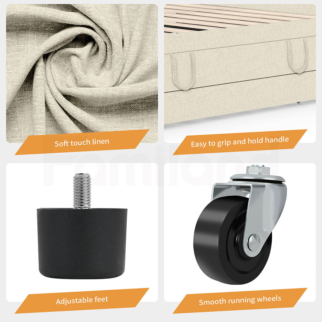 FAMILAND QUEEN SIZE DAY BED FRAME---The queen daybed with trundle and drawer is a versatile and elegant addition to any room. Upholstered in grey linen with a clean, timeless silhouette, this daybed serves as both a stylish bed for the bedroom and a chic seating option in the living room. The multifunctional design of the bed frame queen size offers both comfort and style, whether used as a bed for guests or as a sofa for everyday seating.