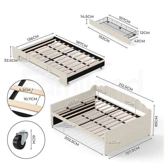 Trundle bed dimensions: 187cm x 136cm x 35cm (L x W x H)