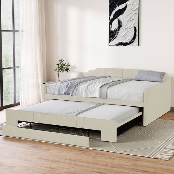 --【Upholstered Bed with Modern Style】The upholstered queen-size daybed with trundle and drawer brings elegance and versatility to any room. With its clean, timeless silhouette, this queen bed frame functions beautifully as a bed in the bedroom and doubles as a chic sofa or seating option in the living room.