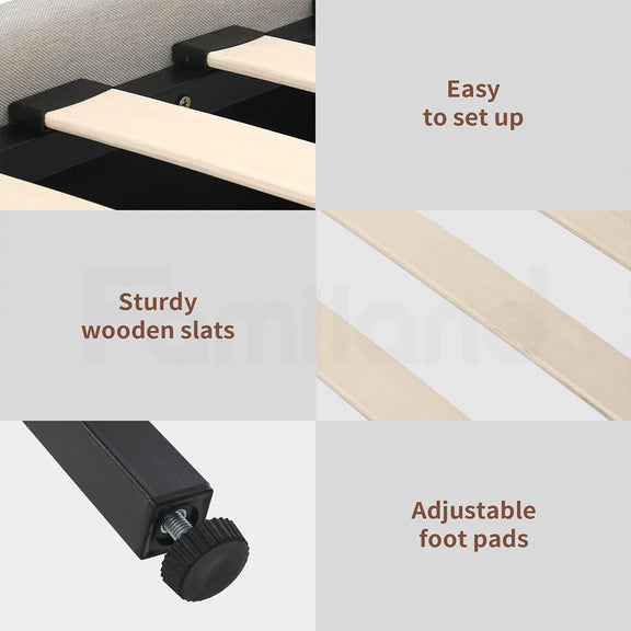 With a practical 6.5-inch under-bed clearance, it offers ample storage space for organizing bedroom essentials while allowing easy access for vacuuming and cleaning. Embrace the perfect combination of style, comfort, and durability with the Familand Queen Size Bed Frame—your ultimate sleep sanctuary.