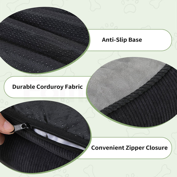 ---【Bonus Rattan Mat】Made from premium corduroy and velvet, the soft, thick fabric creates a warm and cozy spot for your pet to sleep. Additionally, the pet calming bed comes with a rattan mat to keep your pet cool and comfortable during the warmer months.