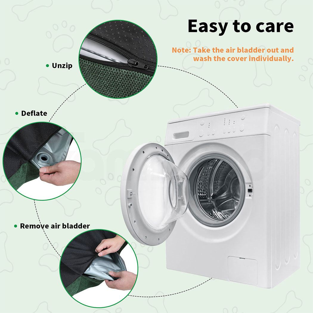 The waterproof inner liner between the fabric surface and inflatable layer prevents urine from penetrating, making cleaning a breeze. The cover of the washable dog bed is removable and can be easily unzipped for washing. Only the outer cover is machine washable—please remove the inflatable cushion before washing the cover separately.