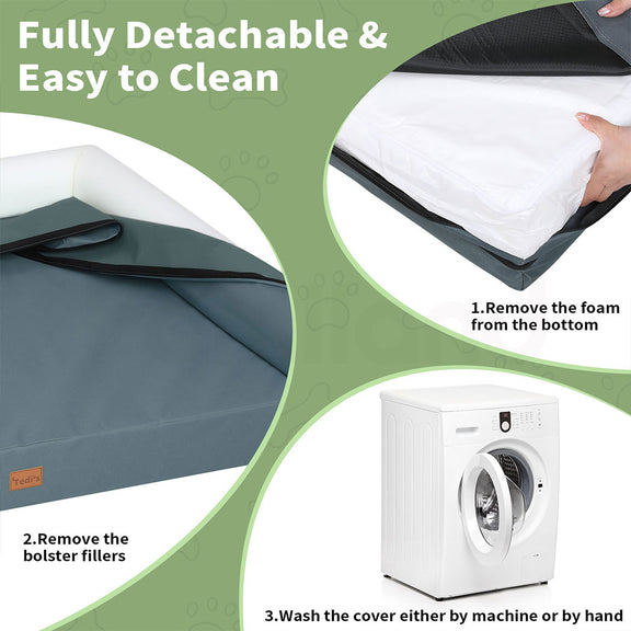 --【Portable & Washable】We understand the importance of convenience, which is why this pet bed is equipped with a handle on the side. This allows for easy transportation or storage, ensuring hassle-free mobility whenever you need it. Simply unzip the dog mattress, remove the memory foam and bolster foam and place the cover in the washing machine. Now that naughty puppy won't cause you any more cleaning problems.