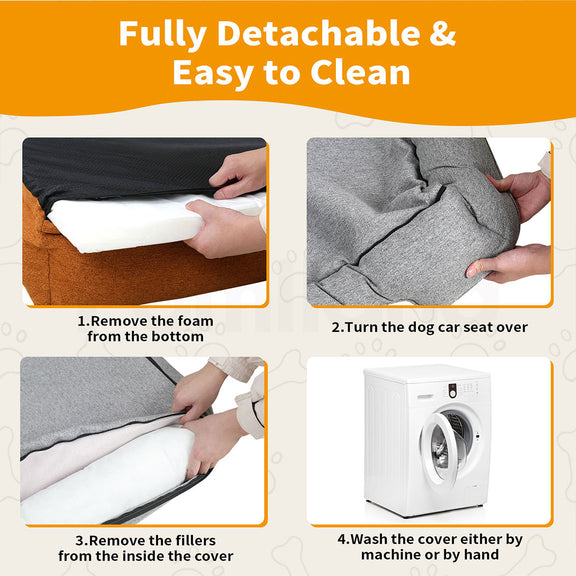 The pet calming bed features a waterproof layer between the fabric surface and bottom filling, preventing urine penetration and keeping the foam dry and mold-free. The zippered cover is removable and machine washable for easy cleaning and hassle-free maintenance. Please note that the inner foam is not washable. For added convenience, a handle is attached for effortless transportation and storage. The non-slip bottom ensures the bed stays securely in place.